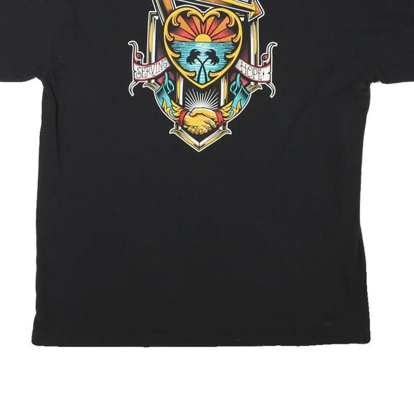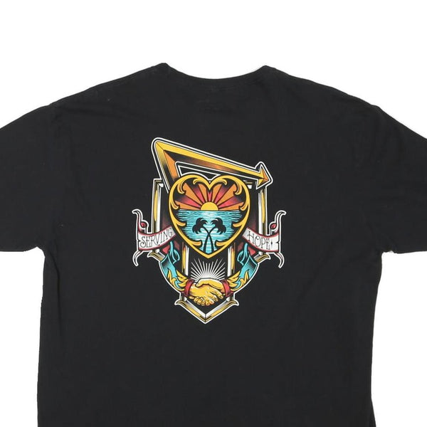 This IN N OUT Mens T-Shirt features a deep black colour as its base with vibrant graphic prints on both the front and back. On the chest is a small heart-shaped emblem showing a sunset over palm trees, while the back presents a larger, intricate design including the same heart emblem, a handshake, and banners reading "Serving" and "Hope". The detailed, colourful graphics provide a striking contrast against the solid black fabric.