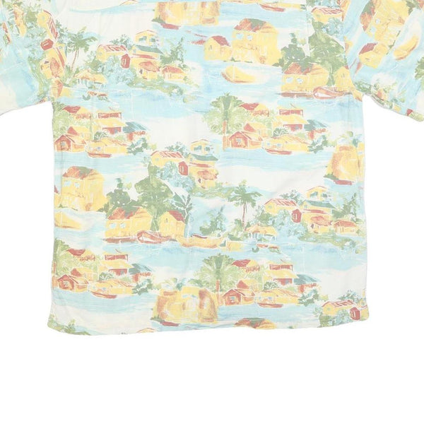 This Island Republic mens shirt features a classic Hawaiian style with an all-over scenic print in soft blues, yellows, and greens reminiscent of coastal landscapes and tropical villages. The short sleeves and button-down front enhance its laid-back, vacation-ready appeal.