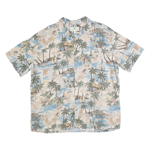 ISLAND SHORES Mens Beige & Blue Rayon Hawaiian Shirt XL Tropical Palm Print