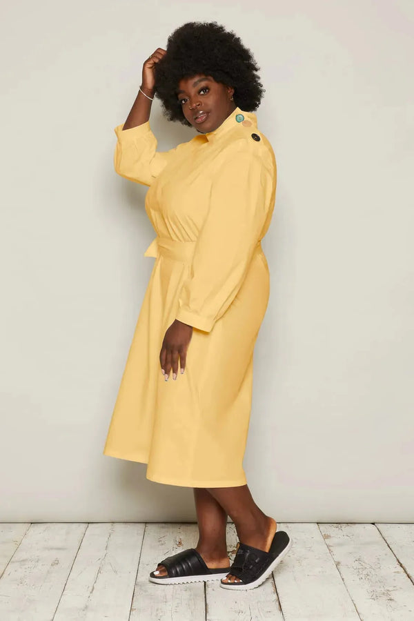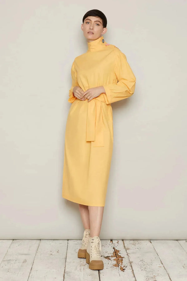 Available in two cool tones; Icy White or Dandelion Orange. Each Jara dress is unique thanks to the eye-catching detail of the large, multi-coloured recycled buttons, which adorn the shoulder.