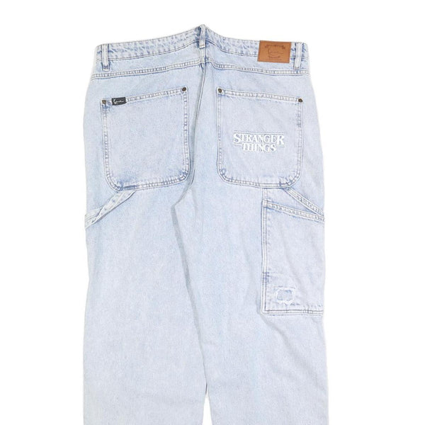The back right pocket is embroidered with 'Stranger Things' branding, complementing the iconic Karl Kani patch on the front left leg along with dice graphic patches. These jeans offer a comfortable loose fit suitable for casual streetwear, blending vintage-inspired style with distinctive branded and distressed accents.