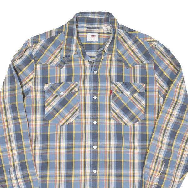 This Levi's mens shirt features a classic checked pattern combining shades of blue, yellow, white, and grey for a vibrant yet wearable look. The design is completed with two chest pockets with buttoned flaps and a small iconic red Levi's tab on the left pocket. It has a traditional pointed collar and white snap buttons running down the front.