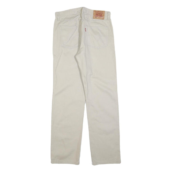 These Levi's mens trousers are crafted from a comfortable cotton blend fabric in a soft beige shade. They feature a classic five-pocket design with silver-tone rivets and a zip closure for ease of wear. The front displays two slanted pockets with a small coin pocket on the right side, while the back has two patch pockets with signature arcuate stitching.