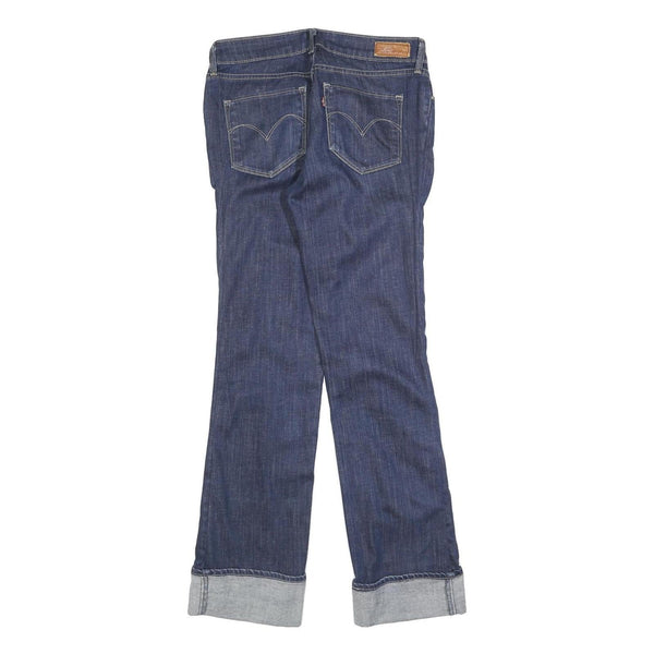 These Levi's womens jeans feature a deep blue rinse denim with a classic straight leg fit. The fabric is a comfortable cotton blend, offering durability with a soft feel against the skin. They have a zip closure and traditional five-pocket styling, typical of Levi's design.