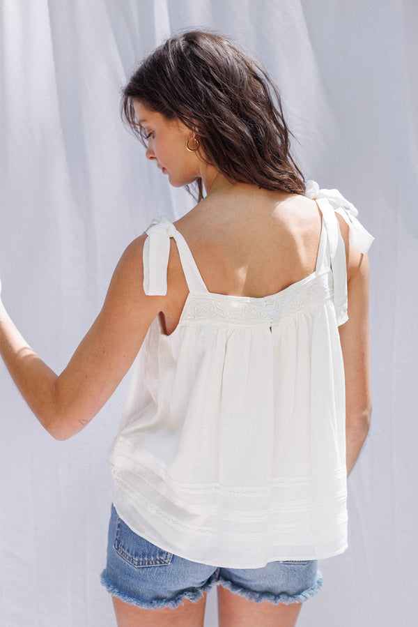 Meet our dreamy, handcrafted Lily tank. This beautiful, effortless top is handcrafted in Bali and features an ultra soft hand feel, romantic floral embroidery at the neckline, delicate lace, and pin tucks. The perfect white top to wear in the warm sun. Her bra-friendly adjustable straps tie in a bow for a feminine touch. She pairs perfectly with shorts or jeans and can be styled for a casual weekend or a romantic sunset dinner. We recommend sizing down for this style.