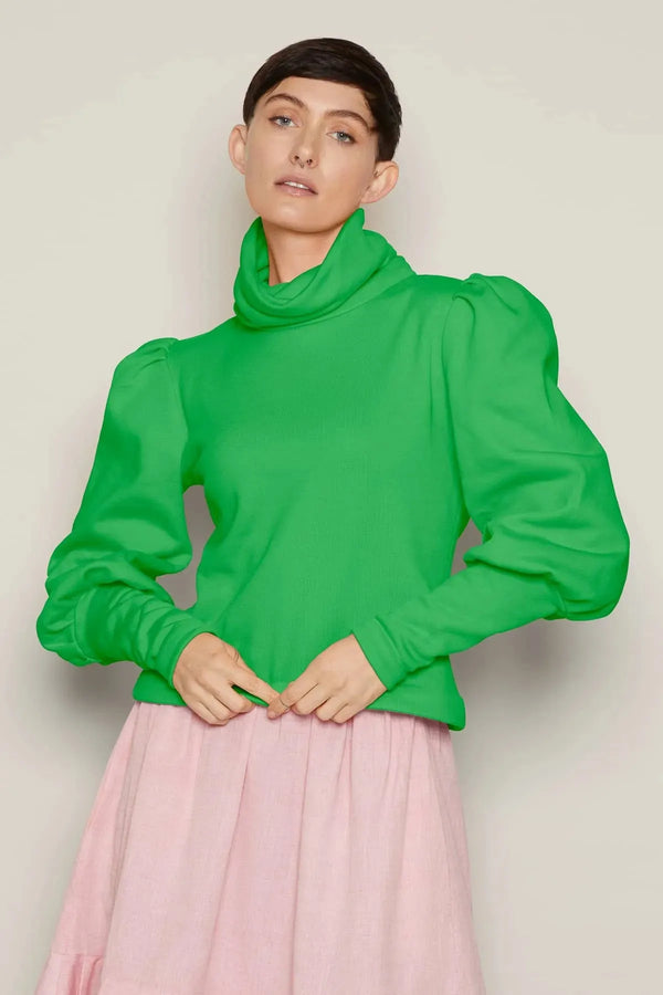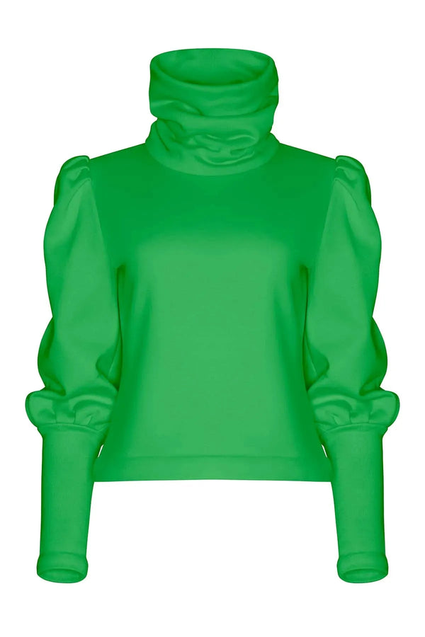 Full bishop sleeves emerge from tucked shoulders and an augmented turtle neck. These twists on the classic jumper give the Logi a sense of power and a dramatic streak.