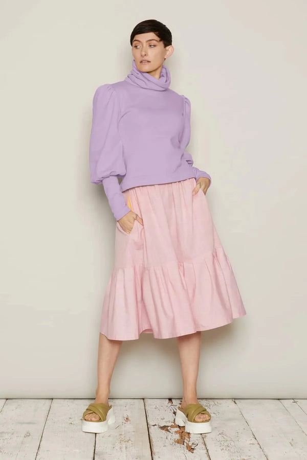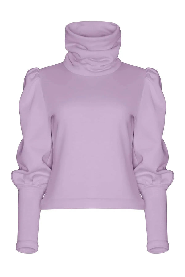 Full bishop sleeves emerge from tucked shoulders and an augmented turtle neck. These twists on the classic jumper give the Logi a sense of power and a dramatic streak.