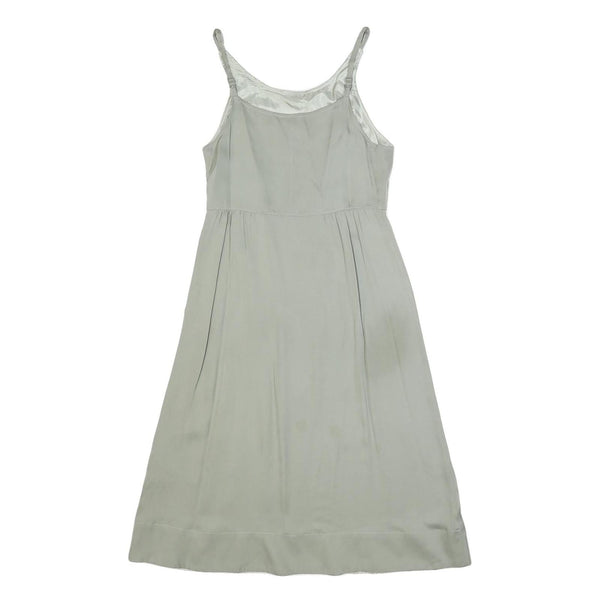 This Marc Jacobs womens dress features a pale green shade with a sleek, minimalist design. The dress includes thin adjustable straps and a smooth silk fabric that adds a luxurious sheen and soft feel. The dress falls to a midi length with a slip style that flatters the silhouette with a gentle fit and flare effect.