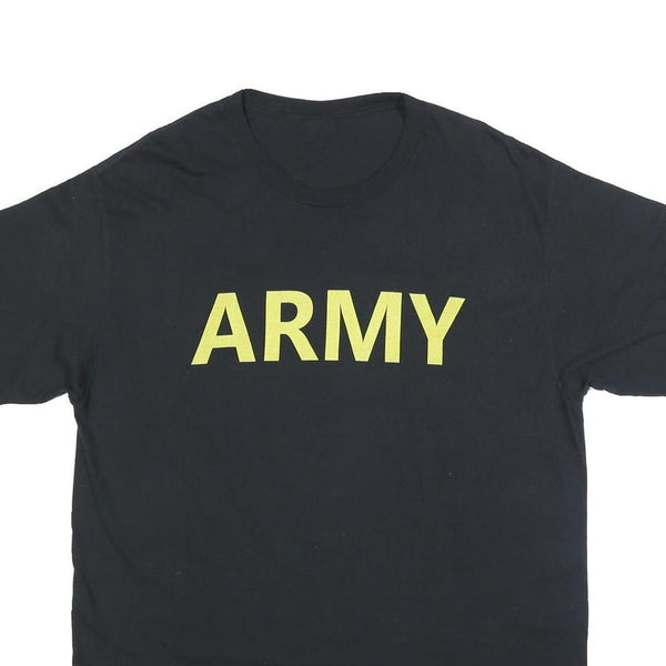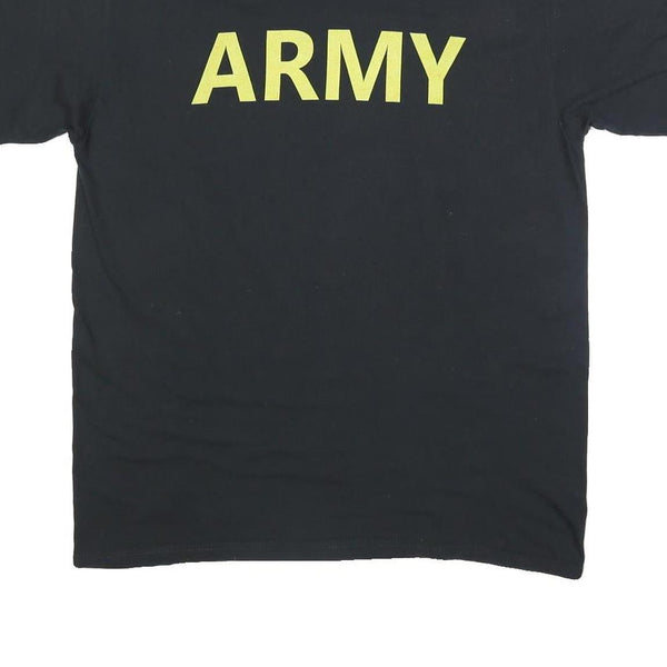 This mens black T-shirt features a bold yellow ARMY print across the chest, presenting a simple yet strong graphic statement. The shirt has a classic short sleeve design and a comfortable crew neckline, making it suitable for everyday casual wear.
