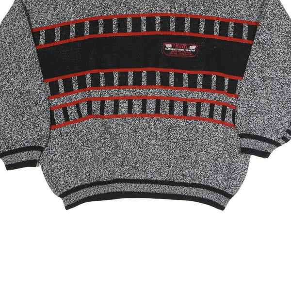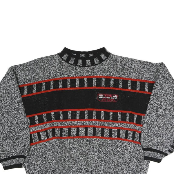 This mens jumper features a distinctive patterned design across the chest and sleeves in black and red, set against a grey background. It includes a black rib-knit crew neck and matching rib-knit cuffs and hem, adding a classic touch to the overall look. There is a small patch on the chest with text detailing "Travel Manufacturing Company" in red and white.