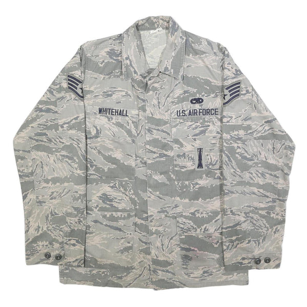 This mens jacket features a grey camouflage pattern typical of military-style apparel. The front is adorned with printed labels including "WHITEHALL" and "U.S. AIR FORCE", along with insignia on the sleeves and chest patches. It has a classic collared design with a button closure and multiple front pockets for practicality.