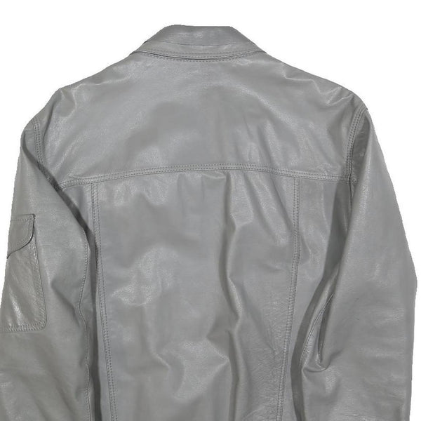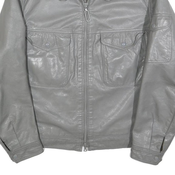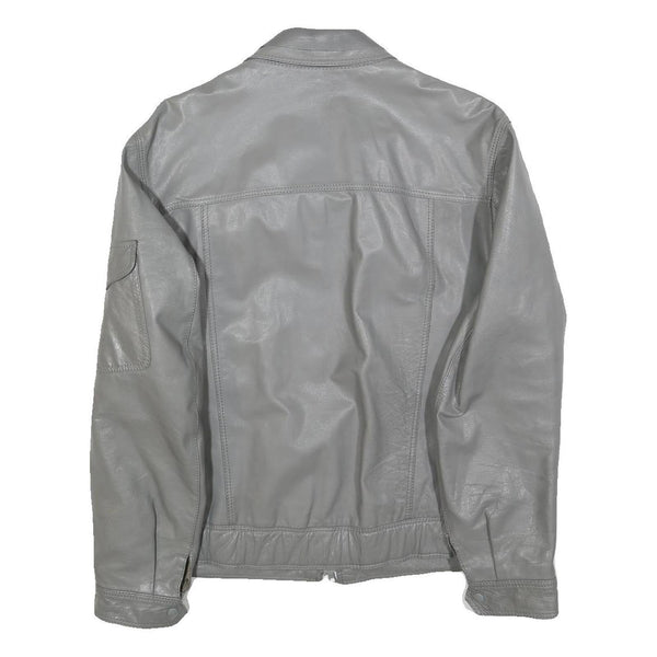 Mens Grey Leather Zip Jacket M Leather Plain Button Collar