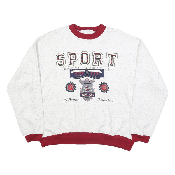 This Mens sweatshirt features a white base adorned with a striking red crew neck and matching ribbed cuffs and hem. The front boasts a bold graphic print spelling SPORT with accompanying decorative badges and text emphasising comfort and quality. The print is mostly in red, navy, and black, lending a sporty, vintage appeal.