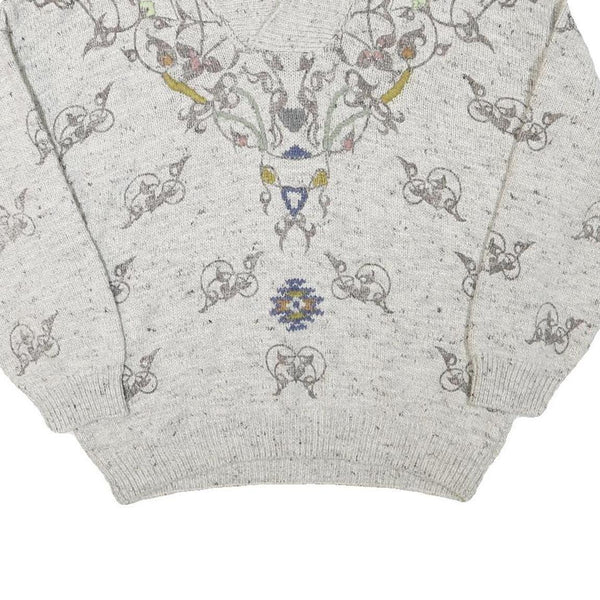 This NANIBON mens jumper features a creamy base colour adorned with intricate patterned detailing in subtle earthy shades. The design includes delicate vines and floral motifs accented with soft hints of blue, yellow, green and mauve, providing an elegant yet vintage-inspired look. The pattern is woven throughout the jumper, adding textural interest to the classic styling.