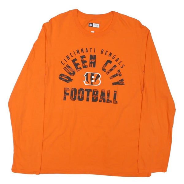 The fit is a standard men's M size, providing a regular and relaxed silhouette with full-length sleeves and a straight hemline. There is no branding on the back, leaving it plain orange. This authentic NFL licensed top celebrates the Cincinnati Bengals American football team with clear team name and emblem references.