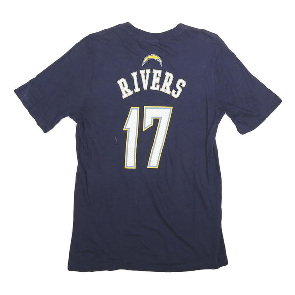 This NFL womens T-shirt features a navy blue colourway with front centre NFL shield logo above the 'Chargers' team name and the number '17' in large print. The back presents the name 'Rivers' above the matching number 17 with a Chargers bolt logo just below the neckline. Crafted from soft cotton fabric, this T-shirt offers comfort and breathability for casual wear or game day.