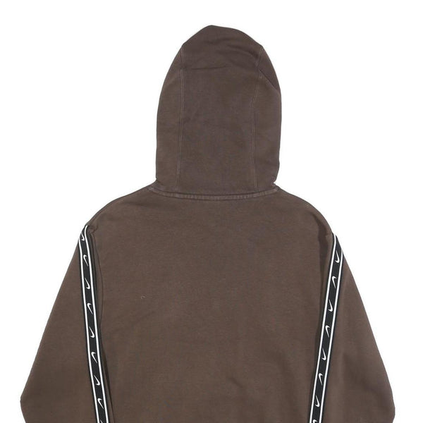 This men's hoodie from Nike features a rich brown colour with a prominent white Nike Swoosh logo across the chest, creating a bold yet classic look. The sleeves are accented with black strips showcasing repeated white Swoosh logos for subtle branded detailing. The hoodie includes a spacious front kangaroo pocket and an adjustable hood with drawstrings.