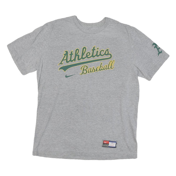 This Nike mens T-shirt is crafted from a soft cotton blend in grey, offering comfort and breathability. The front features bold "Athletics Baseball" text in green and yellow with a small Nike swoosh beneath, creating a sporty look. Additionally, a subtle graphic print appears on the left sleeve with the letter "A" in green.