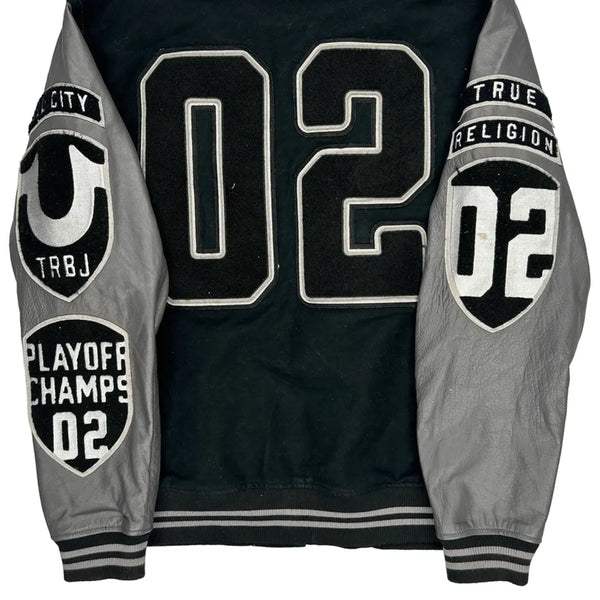 Playoff Champs 02 True Religion Varsity Jacket, fits Xxx-Large.