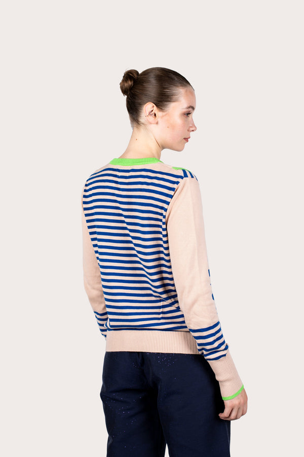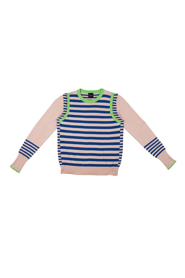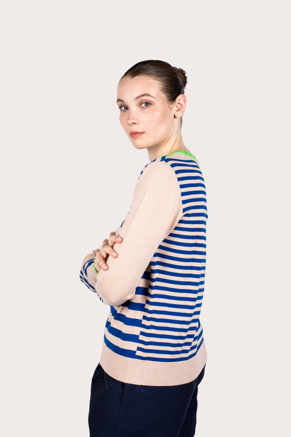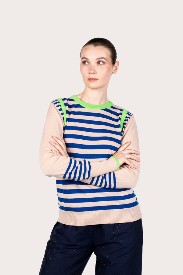 The Fred Sand Sweater, an eco-responsible reinterpretation of the French striped sweater, is adorned with two tones of green. This unisex piece, made in Italy, perfectly embodies the idea that ethical fashion can be both modern and environmentally friendly.
