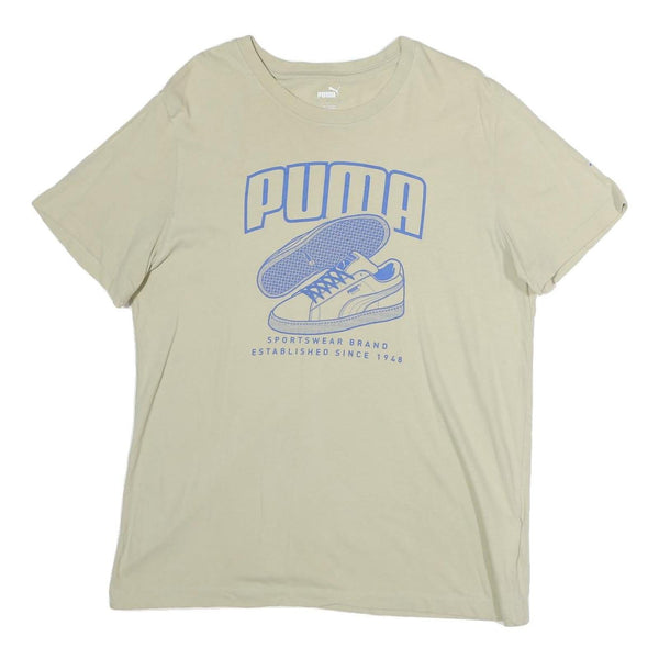 This PUMA Mens T-Shirt features a beige base colour with a distinctive light blue graphic print on the front depicting the brand name and an illustrated sneaker. The front text reads "SPORTSWEAR BRAND ESTABLISHED SINCE 1948," highlighting PUMA's heritage.