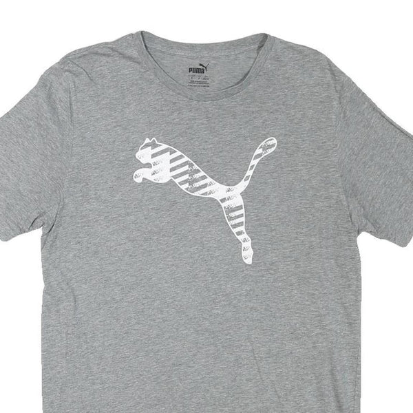 This PUMA mens T-shirt comes in a soft grey colour, featuring a large white Puma cat logo printed across the chest with a striped pattern inside the logo. The shirt is crafted from a comfortable cotton blend fabric that offers breathability and a soft feel against the skin.