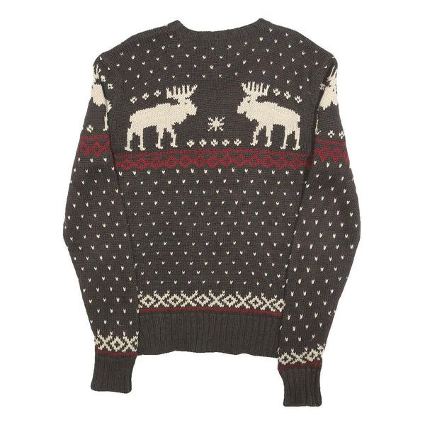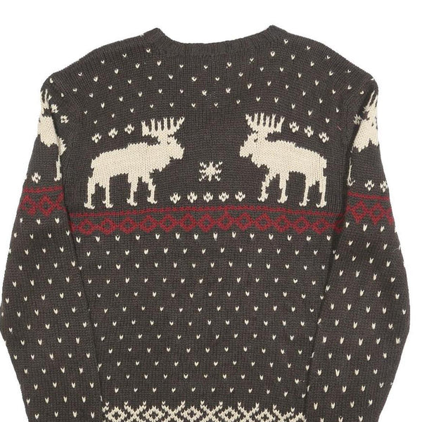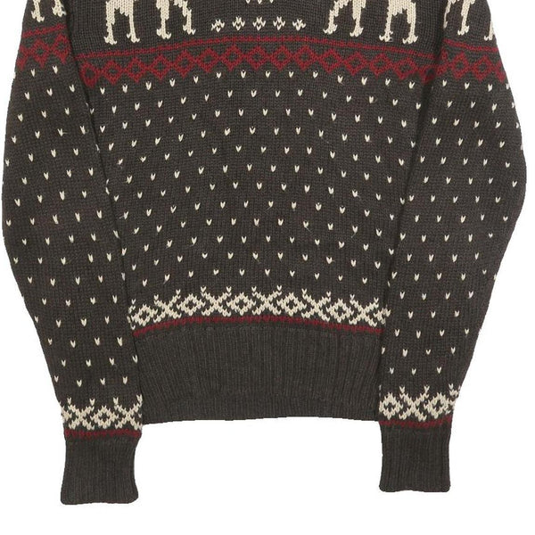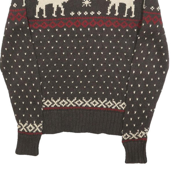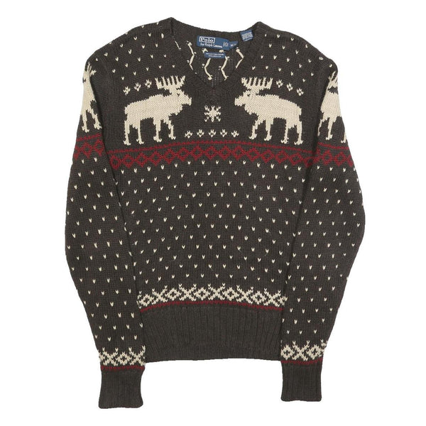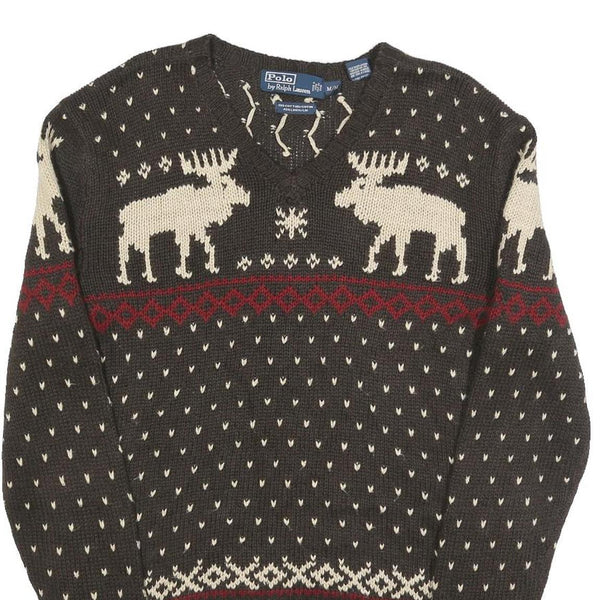 This Polo Ralph Lauren womens jumper showcases a traditional Fair Isle pattern in brown and cream, featuring distinctive moose motifs and subtle red decorative bands for a festive touch. It has a stylish V-neck with a band collar and button closure, enhancing its charming vintage look.