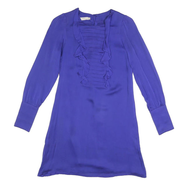 This REISS womens dress features a rich blue silk fabric that offers a smooth, luxurious feel. The dress has a flattering A-line cut with long sleeves and a distinct ruffle and pintuck detailing along the V-neckline, adding a touch of elegance and femininity.