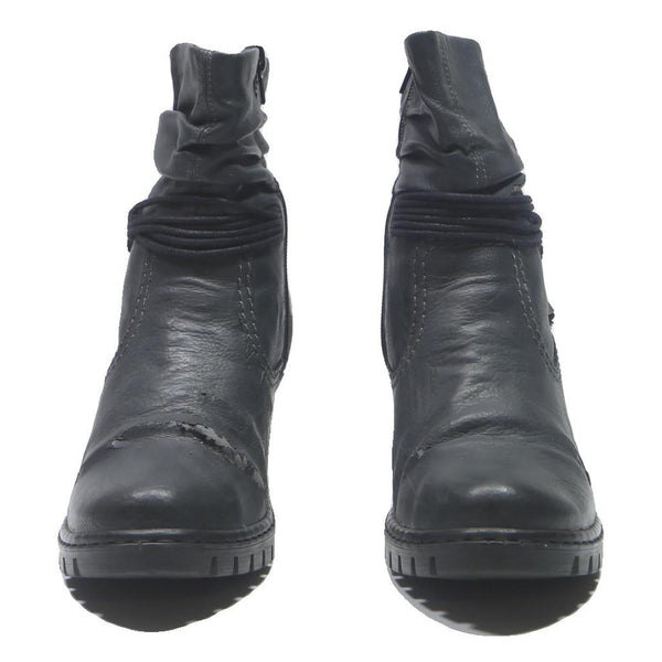 These RIEKER womens ankle boots feature a black synthetic upper with a lightly textured finish. Decorative stitching accents the side panels and a multiple wrap-around cord with silver-toned ends adds style around the slouched ankle.