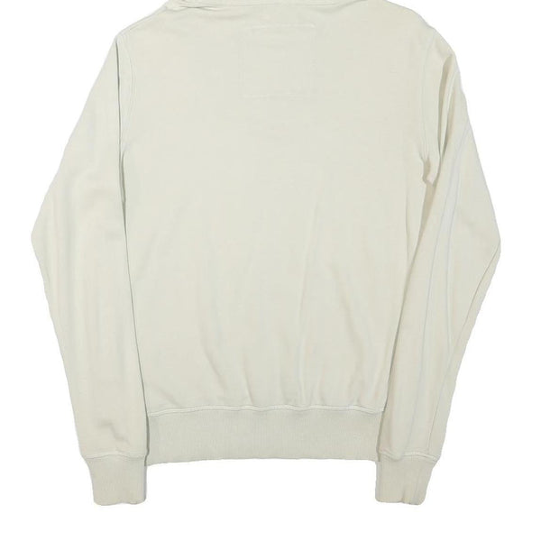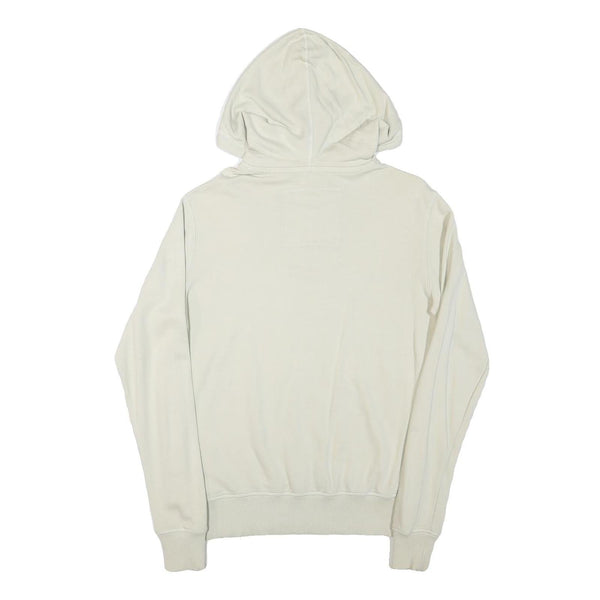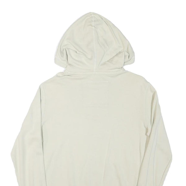 Designed with long sleeves and a hood, this pullover style hoodie is perfect for casual wear. The fabric is smooth and lightweight, making it suitable for layering or standalone use. Ribbed cuffs and hem provide a secure fit and classic hoodie styling, while the back is plain cream without any prints or embellishments.