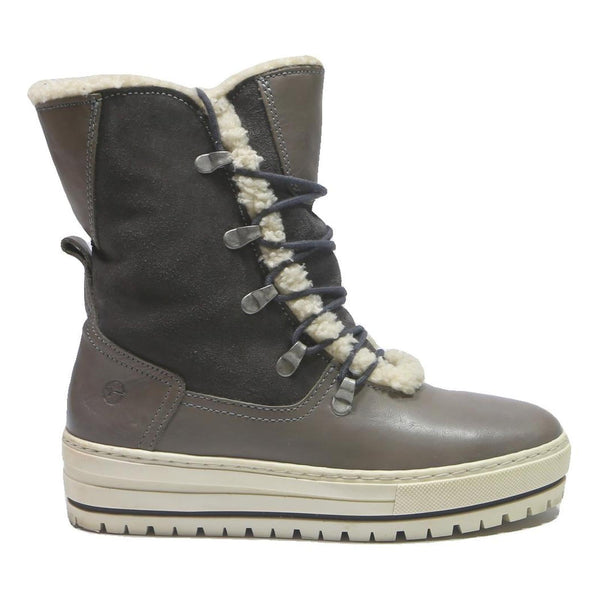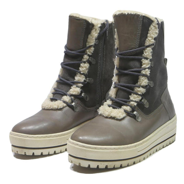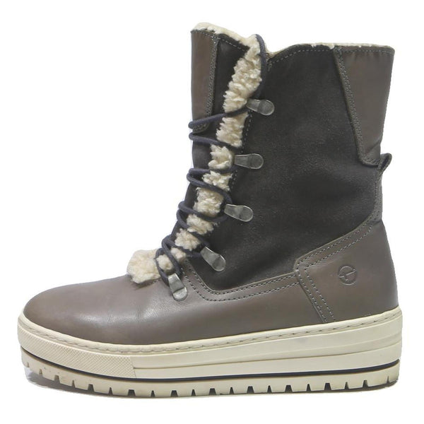 These Tammy ankle boots combine dark grey synthetic leather with black synthetic panels for a stylish contrast. Cream-coloured faux shearling trim lines the tongue and upper edge for a cozy winter look. The lace-up design features grey laces threaded through metal hooks for secure fit adjustment.