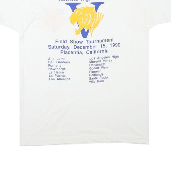 The front has a small graphic with a bold blue "V" and yellow tiger head emblem on the chest. The back showcases a large vintage-style print referencing "The 1st Annual Valencia High School Field Show Tournament" from December 15, 1990, in California, along with a list of participating schools beneath the same emblem.