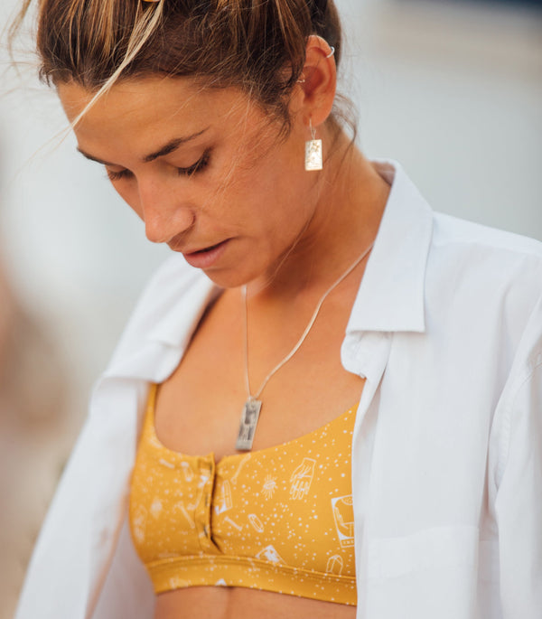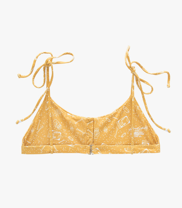 The Button Up top is a bralette top with an adjustable hook-and-eye back, featuring three front center buttons giving it a flirty touch and feminine adjustable tie shoulders for extra comfort.