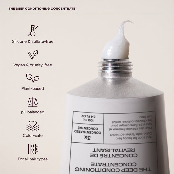 Meet The Deep Conditioning Concentrate. Part daily deep conditioner, part hair mask, all softness, shine and silky strands. This plant-based, ultra-concentrated deep conditioner is filled with skincare ingredients and packed in our new, 100% recycled aluminum tubes