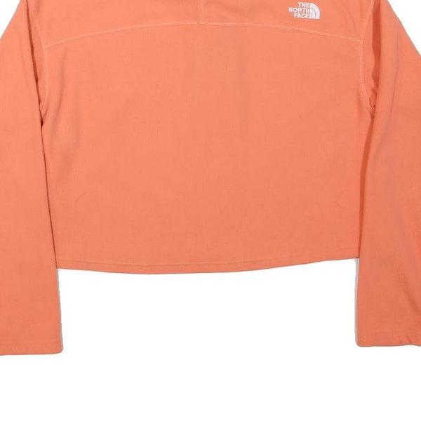 This womens pullover jumper by THE NORTH FACE features a bright coral orange colour that stands out beautifully. It has a high collar with a quarter zip closure in the front and the iconic THE NORTH FACE logo embroidered in white on the left chest and also on the upper back right shoulder. The jumper is cropped with a relaxed fit and long sleeves, offering a modern and sporty look.