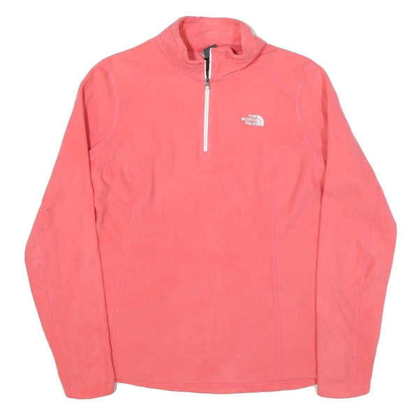 This womens jumper from THE NORTH FACE is crafted in a coral pink shade, featuring a clean, plain design with the iconic brand logo embroidered in white on the left chest. It showcases a practical crew neckline with a quarter zip closure, providing adjustable ventilation and easy layering.