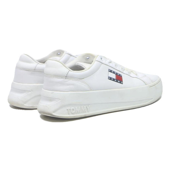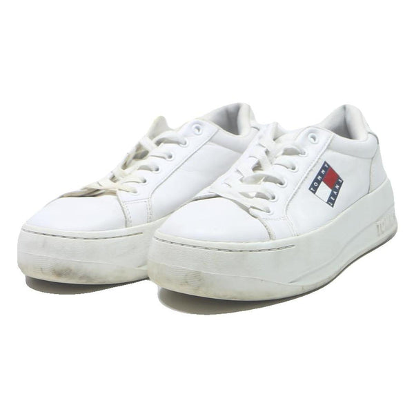 These Tommy Hilfiger womens trainers feature a clean white leather upper with the iconic Tommy Jeans flag logo patch prominently displayed on the sides. The shoes have a lace-up fastening and a thick platform sole embossed with the Tommy branding, adding height and style.