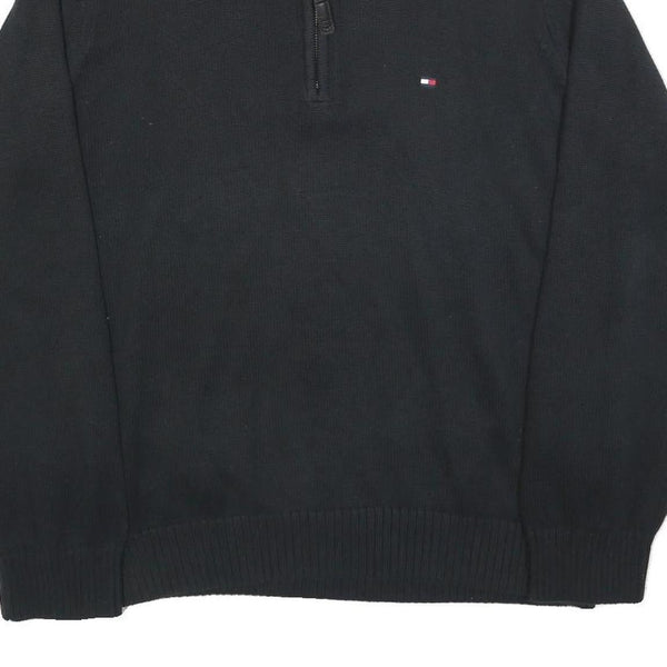 This Tommy Hilfiger mens jumper features a classic black body with a contrasting red ribbed collar detailed with a subtle black stripe. It has a half-zip V-neck design and the iconic Tommy Hilfiger flag logo embroidered on the left chest area. The jumper’s fit is regular, providing comfort and ease of movement suitable for casual wear.