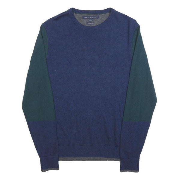 TOMMY HILFIGER Mens Blue & Green Patterned Wool Jumper Crew Neck Basic Knit S