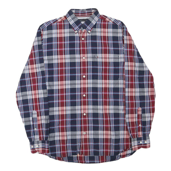 This Tommy Hilfiger mens shirt features a classic check pattern in blue, maroon, white, and accents of light blue. The shirt displays the embroidered Tommy Hilfiger flag logo on the chest pocket, enhancing its distinctive brand appeal. It has a button-down collar and long sleeves with buttoned cuffs, perfect for casual or smart-casual styling.