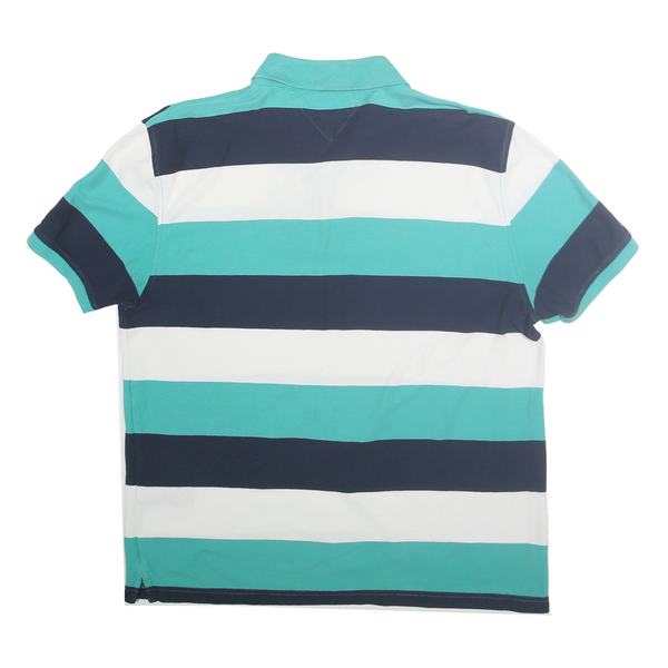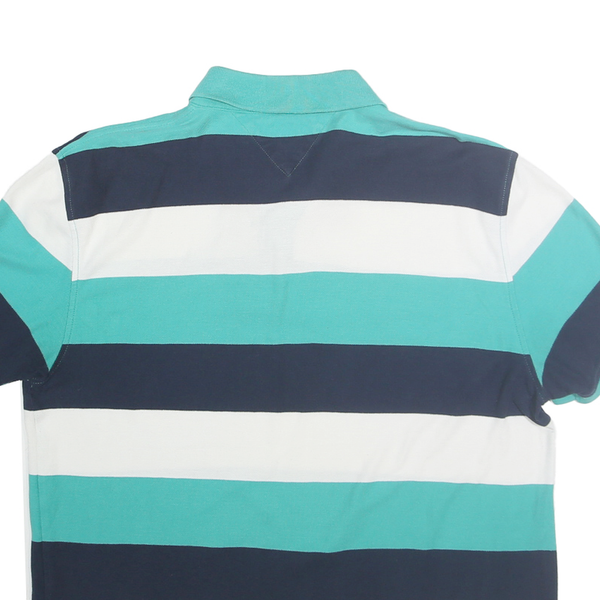 This Tommy Hilfiger mens polo shirt features bold horizontal stripes in teal blue, navy blue, and white, creating a classic yet vibrant look. The iconic Tommy Hilfiger flag logo is embroidered on the chest, adding a touch of brand prestige. It has a traditional polo shirt collar with a two-button placket and short sleeves for comfortable wear.