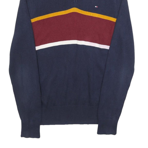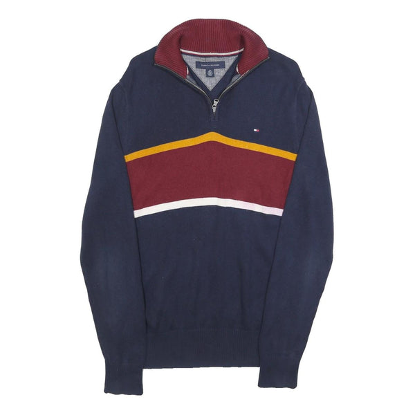 TOMMY HILFIGER Mens Navy & Maroon Colourblock Patterned Cotton Jumper 1/4 Zip S