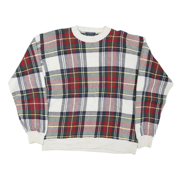 This Tommy Hilfiger jumper features a bold plaid pattern in red, navy, yellow, and white tones. The design is classic and eye-catching with its vibrant check pattern covering the entire jumper including sleeves. The crew neck, cuffs, and hem are finished in solid white ribbed trim.