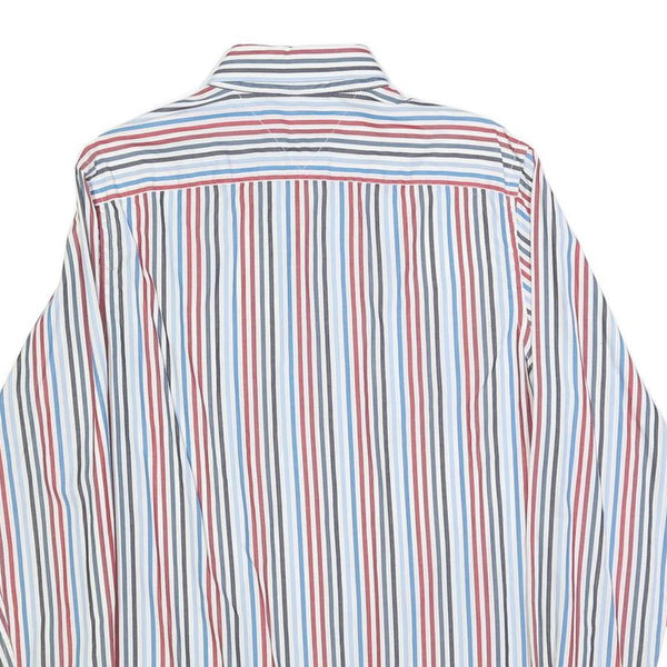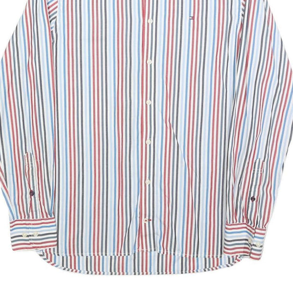 This Tommy Hilfiger mens shirt features a classic vertical stripe design in white, red, blue, and grey tones. The front showcases the iconic Tommy Hilfiger flag logo embroidered on the chest, under a button-down collar. It fastens with white buttons down the front and at the cuffs.