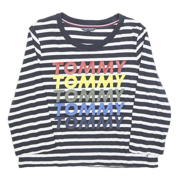 This Tommy Hilfiger womens sweatshirt features classic black and white horizontal stripes across the body and sleeves. The front proudly displays the word "TOMMY" repeated five times in distinct colours, including red, yellow, green, blue, and navy blue, creating a vivid logo print that stands out against the stripes. The neckline is finished with a solid black crew neck trim for a clean look.