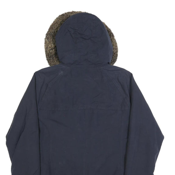 This womens jacket from Tommy Hilfiger is in a deep navy blue tone featuring a zip closure with a flap secured by gold-coloured press-studs. It has a cosy faux fur lined hood and cuffed sleeves in black knit for extra warmth. The exterior fabric is a polyester blend that gives the jacket a durable yet comfortable feel, suitable for cold weather. The jacket is decorated with subtle elbow patches and flap pockets on the front.