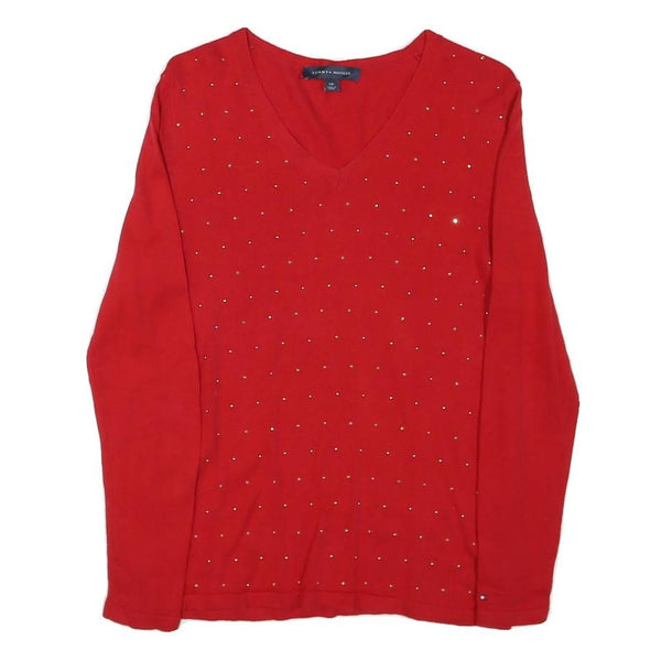 This womens jumper from Tommy Hilfiger is a vibrant red with a subtle plain design enhanced by small reflective studs across the front, adding a delicate sparkle. It features a classic V-neckline and long sleeves, offering a timeless and flattering silhouette suitable for many occasions.