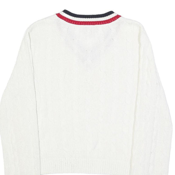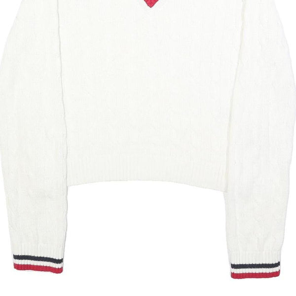 TOMMY JEANS Womens White Patterned V-Neck Cable Knit Jumper M Striped Trim