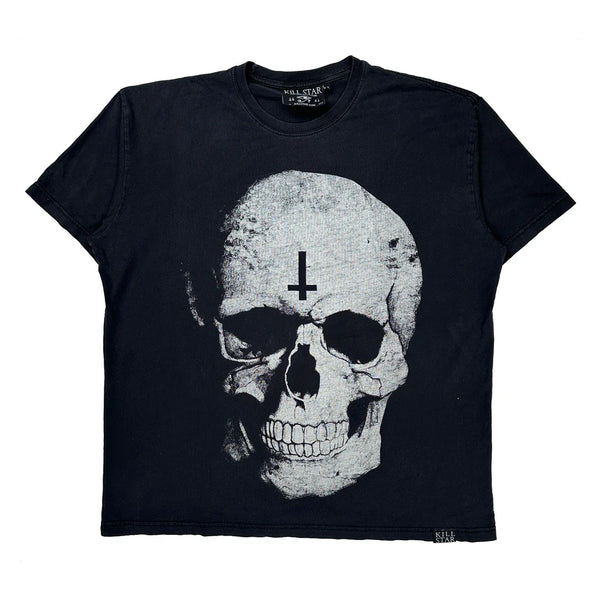Black T-Shirt With Skull Graphic And Inverted Cross.