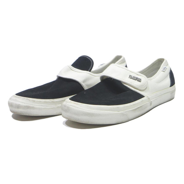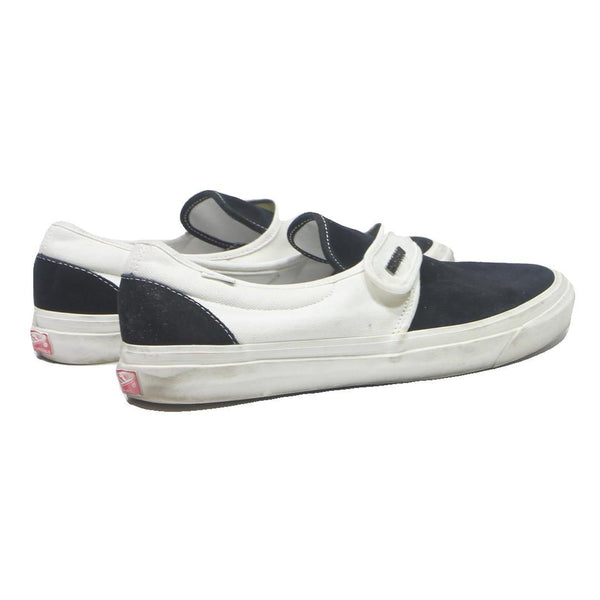 These Vans Slip-On mens trainers feature a classic low top profile crafted in durable canvas with a navy front and heel panel contrasting the white side panels. The design includes a distinctive strap across the front with a metal Vans logo plaque, providing a unique twist on the signature slip-on style. The white rubber sole is slightly worn, evidencing pre-loved status but retains good structural integrity.